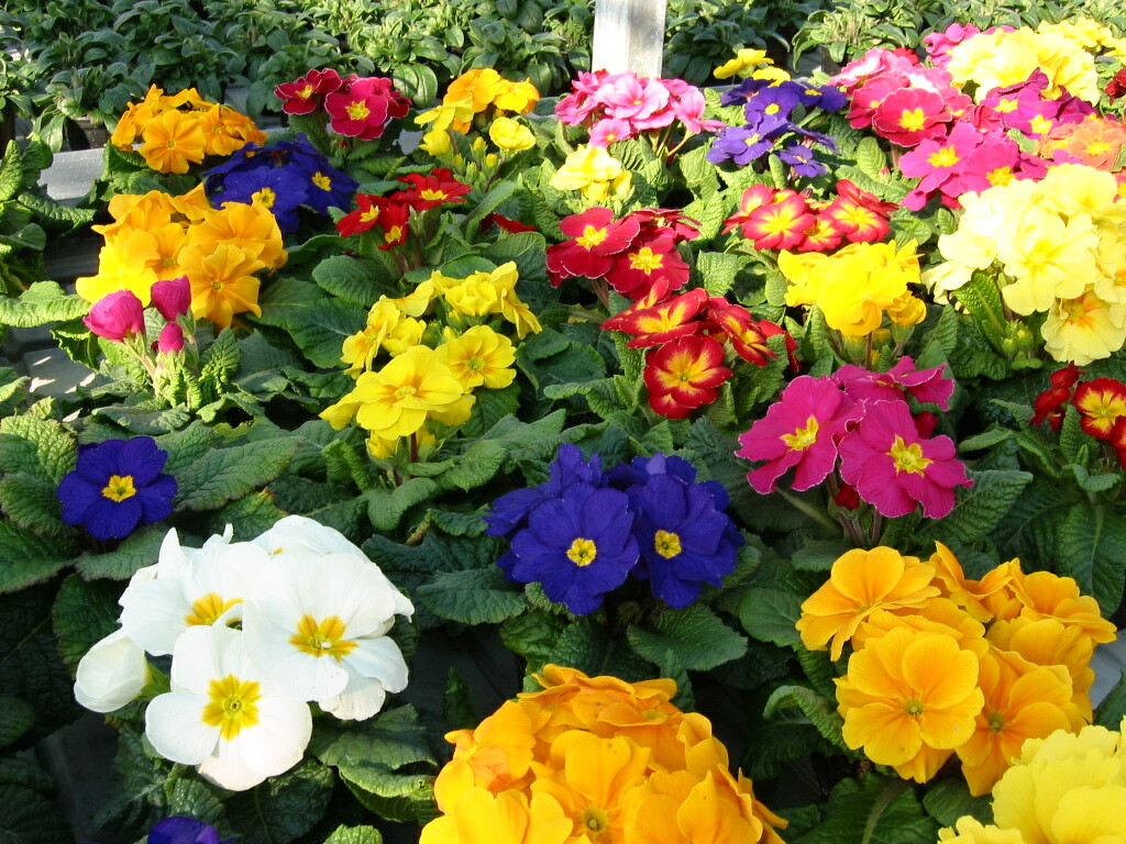 Die Primeln leuchten in einer beeindruckenden Farbpalette – von reinem Weiß über sonniges Gelb und kräftiges Rot bis hin zu tiefen Blautönen.